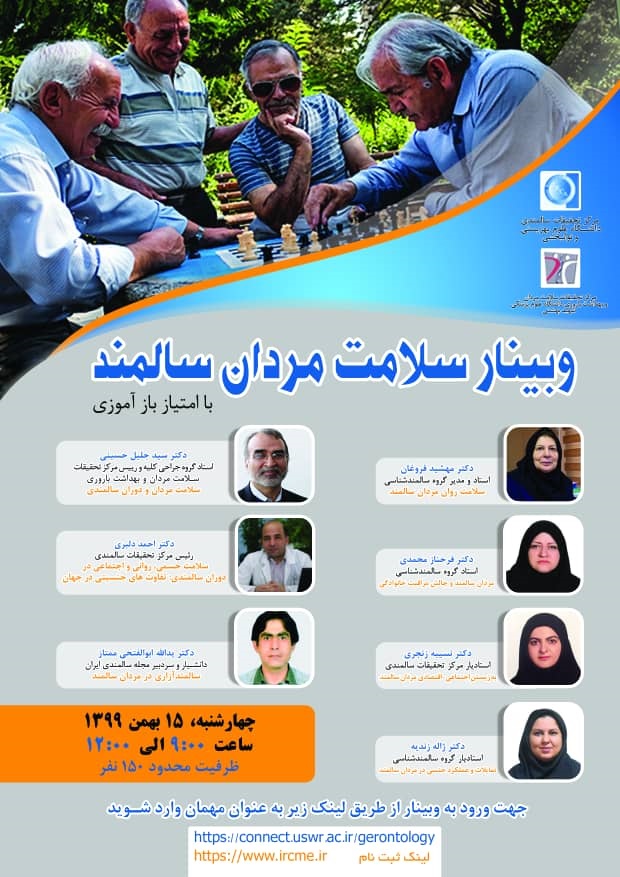 وبینار سلامت مردان سالمند وبینار سلامت مردان سالمند (با امتیاز بازآموزی) توسط مرکز تحقیقات سالمندی با همکاری مرکز تحقیقات سلامت مردان و بهداشت باروری در تاریخ چهارشنبه 15 بهمن برگزار شد. وبینار سلامت مردان سالمند (با امتیاز بازآموزی) توسط مرکز تحقیقات سالمندی با همکاری مرکز تحقیقات سلامت مردان و بهداشت باروری در تاریخ چهارشنبه 15 بهمن برگزار شد. در این وبینار به موضوعات متعددی پیرامون سالمندآزاری در میان مردان سالمند، مردان به عنوان مراقبان خانوادگی، سلامت روان مردان سالمند، بهزیستن و رفاه مردان سالمند و سلامت جنسی مردان پرداخته شد. 1399/12/19 - ٠٧:٤٩ / شماره خبر : ١٨٦٤٣ / تعداد نمایش : 196 برای این خبر نظری ثبت نشده است نظر شما