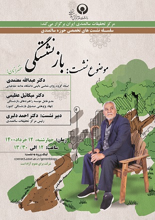 سلسله نشست های تخصصی حوزه سالمندان سلسله نشست های تخصصی حوزه سالمندان توسط مرکز تحقیقات سالمندی برگزار می گردد. سلسله نشست های تخصصی حوزه سالمندان با موضوع بازنشستگی برگزار می گردد. سلسله نشست های تخصصی حوزه سالمندان با موضوع بازنشستگی روز چهارشنبه 12/03/1400 از ساعت 12:00 الی 13:30 برگزار می گردد. سخنرانان: دکتر عبدالله معتمدی استاد گروه روان شناسی بالینی دانشگاه علامه طباطبایی دکتر میکائیل عظیمی مدیر عامل موسسه راهبردهای بازنشستگی دبیر نشست دکتر احمد دلبری رئیس مرکز تحقیقات سالمندی لینک ورود به نشست: connect.uswr.ac.ir/gerontology 1400/03/10 - ٠٩:٤٠ / شماره خبر : ١٩٢٩٥ / تعداد نمایش : 410 برای این خبر نظری ثبت نشده است نظر شما