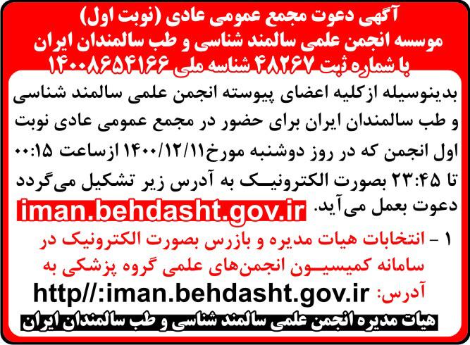 انتخابات انجمن سالمند شناسی و طب سالمندان در تاریخ 11/12/1400 به صورت الکترونیک برگزار می گردد.
